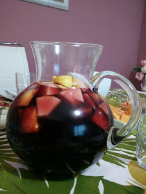 Al supermercato ho trovato un brick con il preparato per Sangria già pronto, una miscela di vino e spezie veramente buona. Ho messo il brick in frigo e mezzora prima di servire la sangria vi ho aggiunto mele e pesche tagliate a cubetti e fette di arance. Rimettere la sangria in frigo fino a che non sarà portata a tavola. Deve essere servita ben fredda